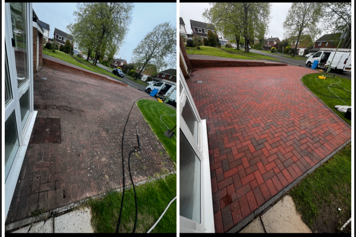 For driveway and patio cleaning, we use professional high-pressure jet washing equipment, including high-performance rotary surface cleaners. This allows us to clean efficiently and evenly without damaging the surface.